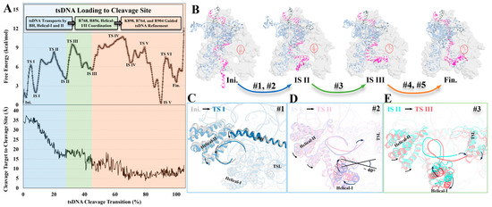 The MFEP of the tsDNA cleavage transition and the significant structural difference during the cleavage transition. Stage 1 is from Ini. to IS II, colored in blue; Stage 2 is from IS II to IS III, colored in green; Stage 3 is from IS III to Fin., colored in orange (A). The top one is the MFEP of the transition; the first stage is colored in blue, describing the tsDNA transported by protein domains; the second stage is colored in green, describing residues working in conjunction with protein domains while moving the tsDNA; and the third stage is colored in orange, describing the residues taking control of the tsDNA. The bottom one shows the distance from the tsDNA to the cleavage site during the transition process. (B) The structural differences between each IS, the protein is a transparent surface, tsDNA is colored in magenta, sgRNA is colored in pale blue, and ntsDNA is colored in grey; each different colored arrow corresponds to the color of the stage, and red circles are the location of the cleavage site. (C–E) The enlarged structural changes during the energy barriers.
