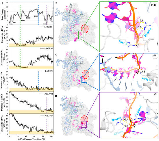 For the ease of presenting the detailed mechanism, we categorize the progression from the ntsDNA to the tsDNA cleavage state into three distinctive stages (Figure 2A), each separated by the distance between the cleavage target (tsDNA) and the active cleavage site (Asp659RuvC, Glu756RuvC, and Asp922RuvC).
