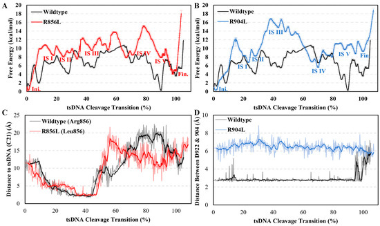MFEP for the mutations of R856L and R904L. (A,B) The comparison from R856L and R904L to wildtype MFEP; wildtype in black, R856L colored in red, and R904L colored in blue. (C) The distance between the tsDNA and residue 856TSL; wildtype colored in black, and the R856L mutation colored in red. (D) Distance between the cleavage site and residue 904TSL; wildtype colored in black, and the mutation colored in blue.