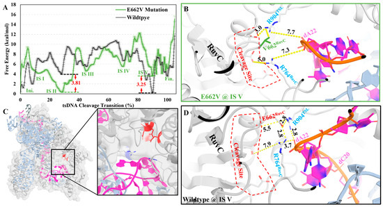 Comparison between the wildtype and mutation structure around residue 662RuvC. (A) The comparison between the wildtype and the E662V mutation MFEP; wildtype in black and E662V colored in green; red number indicates the difference between the same IS for different MFEPs. (B) The IS V for the E662V mutation protein is colored in white, and sgRNA is colored in pale blue; tsDNA is colored in magenta, and Val662RuvC is colored in green. (C) The spatial location of the structure analysis; protein is colored in white cartoon or stick mode, sgRNA is colored in pale blue in cartoon mode; tsDNA is colored in magenta as a cartoon model. (D) The IS V for wildtype, protein is colored in white and sgRNA are colored in pale blue; tsDNA is colored in magenta.