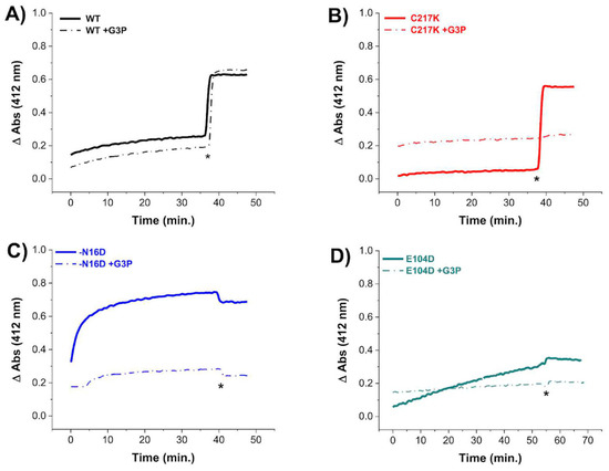 Cysteine quantification under native conditions of HsTPI WT and mutants incubated with G3P. Differential derivatization of Cys residues in HsTPI-WT, C217K, N16D, and E104D was observed in the presence of G3P. Enzymes were incubated at 200 µg for 56 h at 37 °C: (A) WT (black line), (B) C217K (red), (C) N16D (blue), and (D) E104D (green). Enzymes incubated with 1 mM G3P are represented by dashed lines, while controls are indicated by solid lines. After incubation, Cys residue accessibility was monitored with 4 mM DTNB, with readings taken at 412 nm from 0 to 60 min. Samples were denatured via the addition of SDS (indicated by asterisks). The absorbance of the blank buffer was subtracted from each sample. Experiments were performed in triplicate and yielded qualitatively identical results.
