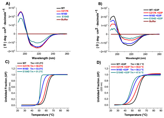 2.5. CD Spectroscopy Reveals G3P-Induced Secondary Structure Alterations and Reduced Thermal Stability in N16D and E104D Mutants