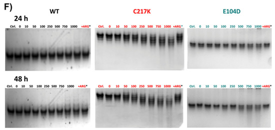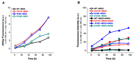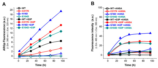 In the absence of G3P, the fluorescence signal was minimal (Figure 6A), whereas, upon G3P addition, a progressive increase in fluorescence signal was observed, attributed to ARGp formation. As seen in Figure 6A, the ARGp formation at 96 h shows the differential effect of incubation with the substrate on the mutants vs. the WT; the N16D enzyme being the most susceptible to ARGp formation, incubation time increased its signal at 395 nm by 3-fold. C217K increased by 2-fold and E104D by 0.6-fold compared with the signal recorded for the WT in the presence of G3P. Remarkably, this increase was most prominent in N16D, followed by C217K, E104D, and WT, strongly suggesting the formation of ARGp in the mutant enzymes compared with the WT in the presence of the G3P substrate.