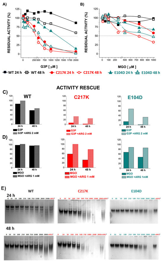 Differential kinetic and structural effects induced by G3P or MGO in HsTPI-WT, C217K, and E104D. Enzymes were incubated for 24 or 48 h with increasing concentrations of G3P (0, 10–2000 µM) or MGO (0, 10–1000 µM). (A) Residual activity plots for the three proteins incubated with G3P at both times: WT at 24 h (black squares) and 48 h (open black squares), C217K at 24 h (red circles) and 48 h (open red circles), and E104D at 24 h (green triangles) and 48 h (open green triangles). (B) Comparative residual activity of proteins incubated with MGO. (C,D) The residual activity with arginine (squared bars) for each enzyme at 24 or 48 h is compared with that of the protein without arginine at the same time (plain color bars), (C) Bar graphs showing the protective effect of arginine at the highest concentration of G3P (2000 µM) or D) MGO (1000 µM) at 24 or 48 h. (E,F) Effects of protein destabilization observed in N-PAGE induced by G3P (E) or MGO (F) over the incubation period. The differential effect of equimolar addition of arginine (asterisk) as an MGO scavenger on TPI-G3P reactions (2000 µM) or TPI-MGO (D) (1000 µM) for the WT, C217K, and E104D enzymes is shown in the N-PAGE. Each experiment was performed in duplicate.