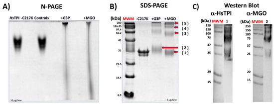 Prolonged incubation of TPI-C217K with G3P or MGO resulted in the formation of aggregates, which exhibited limited mobility on N-PAGE (Figure 9A). The enzymes that formed adducts with G3P or MGO showed relatively high molecular masses and were not filtered on N-PAGE (Figure 9A). This result strongly suggests the formation of gly-cation-modified species, including monomers and oligomeric forms of higher molecular mass in C217K. Notably, these soluble aggregates exhibited higher molecular masses than the tetrameric form of TPI, reinforcing the idea of glycation-mediated cross-linking with G3P and MGO (Figure 9B). Finally, Western blotting revealed these aggregates using an-ti-HsTPI and anti-MGO antibodies (Figure 9C). Thus, the formation of high-molecular-weight species resulting from glycation-induced cross-linking highlights the importance of understanding AGE-mediated protein aggregation pathways [30].