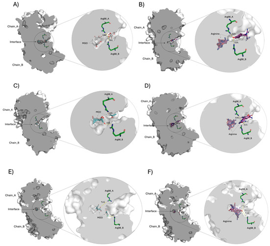 Molecular docking comparison of the crystallographic structures of TPI with different conformers of the MGO and Arg ligands. The centrally sliced molecular surface of HsTPI dimer is observed, highlighting the interface cavity between the subunits (chains A and B). Panels (A,B) correspond to docking of HsTPI-WT with MGO and Arg, respectively, revealing the ligand interactions within the interfacial cavity. Panels (C,D) display the docking results for HsTPI-E104D with the same ligands, MGO and Arg, in the interface region. Panels (E,F) correspond to the docking of the HsTPI-N16D variant with MGO and Arg, respectively. Across all models, Arg98 residues from both subunits are positioned closest to the interfacial cavity, interacting at distances between 3.0 to 9 Å. In all figures, the MGO and Arg ligands are shown in cyan and magenta colors, respectively. While the aminoacyl residue of Arg98 in both chains is shown in green color. Modeled with PyMOL version 2.5.0 (Schrödinger Inc., New York, NY, USA).