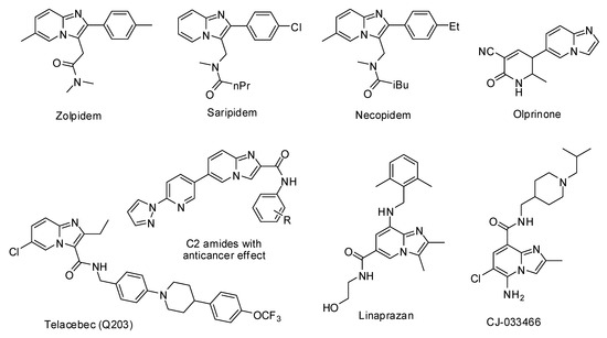 Among marketed drugs and potential drug candidates based on the imidazo[1,2-a]pyridine core, there are several examples of amide derivatives. Commercialised imidazo[1,2-a]pyridine drugs with amide functionalities in the side chains include C3 substituted GABA receptor agonist Zolpidem [19] (Figure 1), used in the treatment of insomnia, and anxiolytic agents Necopide and Saripidem [20], as well as C8-functionalised phosphodiesterase inhibitor Olprinone [21], prescribed for treating heart failure.