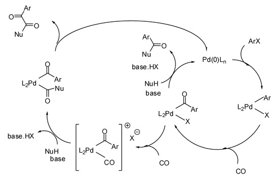 General mechanism of mono- and double carbonylation of aryl halides in the presence of nucleophiles.