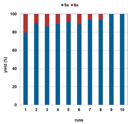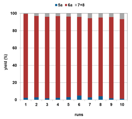 The recyclability of the catalyst and Pd-leaching were investigated under different conditions. At high pressure, good activity and excellent selectivity for α-ketoamide (6a) could be achieved in ten subsequent experiments in DMF (Figure 4). Only a slight increase in the percentage of side products 7 and 8 could be perceived. In toluene, a progressive rise in the ratio of the amide 5a was observed in the recycling experiments, while the application of 1,4-dioxane did not lead to a noticeable change in selectivity on catalyst reuse (Figure 5). Under lower pressure and at a higher temperature, monocarbonylation prevailed in toluene (Figure 6). The ratio of the amide product 5a was even enhanced when the catalyst was recycled, similarly to the high-pressure experiments carried out in this solvent. After the 8th cycle, exclusive formation of compound 5a could be detected.