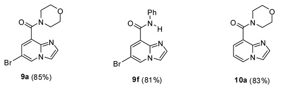 - (6-Bromoimidazo[1,2-a]pyridin-8-yl)(morpholino)methanone (9a): yield: 85%, brown solid, mp.: 164–167 °C, Rf: 0.51 (EtOAc/toluene/MeOH = 5/1/1).1H-NMR (400.13 MHz, CDCl3) δ: 8.34 (d, J = 1.6 Hz, 1H); 7.67 (d, J = 1.1 Hz, 1H); 7.60 (d, J = 1.1 Hz, 1H); 7.34 (d, J = 1.6 Hz, 1H); 3.86–3.92 (m, 2H); 3.80–3.85 (m, 2H); 3.63–3.70 (m, 2H); 3.29–3.37 (m, 2H). 13C{1H} NMR (100.6 MHz, CDCl3) δ: 164.3; 140.4; 135.1; 127.0; 126.8; 126.6; 113.3; 106.6; 67.0; 66.8; 47.8; 42.7. MS m/z (rel. int. %): 309/311 [M]+ (1); 195/197 (13); 117 (13); 89 (11); 76 (4); 62 (13); 56 (100); 54 (21); 42 (25); 39 (4). IR: (cm−1) 715; 825; 995; 1107; 1141; 1207; 1281; 1300; 1437; 1458; 1491; 1546; 1624; 2853; 2905; 3036.
