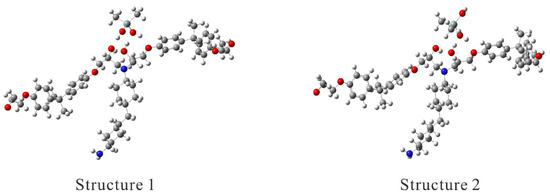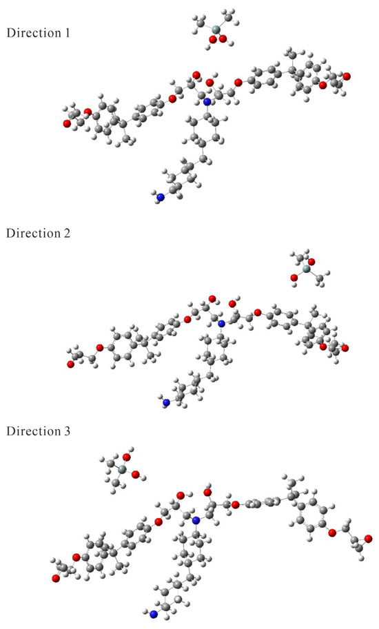 In the quantum chemical calculations, the DFT hybrid functional B3LYP, which is the most widely employed functional, and the 6-31G basis set were employed. Initially, several hydrogen-bonded systems were created between Si(CH3)2(OH)2 and a tertiary amine product derived from two identical epoxy molecules—DGEBA (bisphenol A diglycidyl ether) and one amine molecule (PACM, 4,4′-methylenebis(cyclohexylamine))—using the AFIR method. Two different structures were chosen from the stable structures obtained from interactions from random directions: (1) a fully hydrogen-bonded system between two hydroxyl groups in Si(CH3)2(OH)2 and two hydroxy groups in the reaction product, and (2) a half-hydrogen-bonded system between one hydroxy group in Si(CH3)2(OH)2 and one hydroxyl group in the reaction product. The equilibrium structures (EQs) of the two supermolecules were determined through structural optimization calculations (Supplementary Materials).