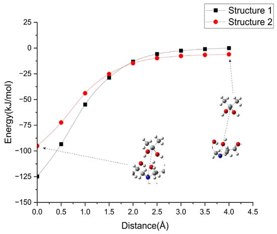 In AFIR calculations, a stable equilibrium structure is achieved when the added negative energy is small, starting from an equilibrium structure. However, if the added negative energy exceeds the activation energy barrier of the dissociation reaction pathway, an equilibrium structure cannot be reached. In such a case, the inter-fragment distance increases, leading the GRRM program to determine dissociation. We investigated the dissociation of Structures 1 and 2 by adding energy to separate them. For comparison, we calculated the potential energy curves when the rigid molecular fragments moved apart (Figure 2). The distance of 0 in Figure 2 corresponds to 5.62 Å and 5.70 Å for the length of Si-N(nearer) in Structures 1 and 2, respectively. The energy 0 in Figure 2 corresponds to the interaction energy of Structure 1 at the distance 4.0 Å (equivalent to 9.62 Å between Si and N (nearer)), while the relative energy for Structure 2 at this distance was −6.1 kJ/mol.