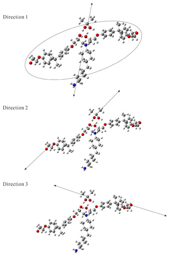 We varied the energy of dissociation in the AFIR method in increments of 2.5 kJ/mol to investigate the energy at which the GRRM program determined that dissociation occurred beyond the activation energy. We aimed to vary the direction of dissociation by specifying the fragment group or atom, with the three calculated dissociation directions shown in Figure 3. In Direction 1, all atoms in the Si-containing molecules were fixed as fragment A, while all 139 atoms in the tertiary amine product molecule (DGEBA-PACM-DGEBA) were included in fragment B. As the DGEBA-PACM-DGEBA molecule has a two-dimensional structure, the direction in which the atoms in this molecule were pulled was limited. In Directions 2 and 3, the central Si atom was fixed as fragment A, and one of the unreacted oxygen atoms in two terminal epoxy groups in DGEBA of DGEBA-PACM-DGEBA was set as fragment B. The calculated threshold energy (minimum energy) values for dissociation along Directions 1–3 are listed in Table 1. Fragments A and B dissociated at energies greater than or equal to those indicated in Table 1. To compare the minimum energy for dissociation involving hydrogen bonds of hydroxy groups with other cases, we conducted AFIR calculations for Si(CH3)4 and (CH3)2SiF2 with DGEBA-PACM-DGEBA, as listed in Table 1. All structural coordinates of the equilibrium structures are provided in the Supporting Information. Notably, obtaining the transition structure on the reaction path leading to the dissociation channel from the equilibrium structure of a hydrogen-bonded system involving multiple hydroxy groups was difficult. As a result, we could not estimate the activation energy of dissociation in this study of the giant molecular system using the conventional reaction path search method with the GRRM program.