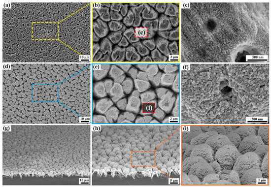 SEM micrographs of the fs laser ablated microstructures on the Si surface at different magnified views (a–c) generated by using the laser fluence F: 10.7 mJ/cm2 under water; SEM images of the microstructures after depositing 80 nm Au NPs (d–f); panels (g–i) report a 70° rotation view of the corresponding SEM images of the microstructures after depositing Au NPs.