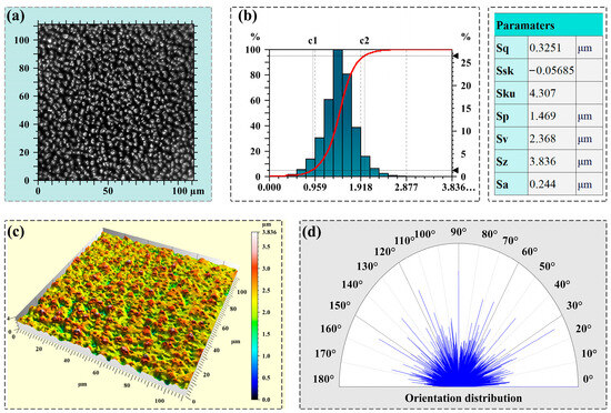 Moreover, the roughness parameters, which have been computed from the 3D confocal microscope images, are depicted on the right-hand side of panel (b). Here, the roughness parameters, Sa and Sq, are employed to assess surface roughness, with Sa representing the average height deviation and Sq revealing the root mean square height. Given the prevalence of micro/nano structures and particles with diverse sizes and shapes, the adoption of statistical metrics akin to mean surface grain radius, such as root mean square roughness, becomes imperative. Specifically, Sku quantifies the sharpness of the roughness shape, and a value of Sku = 4.3 > 3 signifies a prominently mountainous structural profile. Furthermore, Ssk determines the tendency of the roughness shape, classifying it as concave, symmetric, or convex. Since Ssk = −0.0569 < 0, this indicates that after laser processing, the height distribution lies predominantly above the average surface level, pointing towards a peak-like structural configuration.