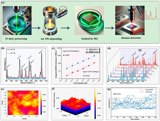 Figure 3a illustrates the comprehensive process for the preparation and characterization of microstructured Si substrates, along with the implementation of Raman detection. As illustrated, the Si substrates underwent initial processing with an fs laser. Following this, a layer of Au NPs with the thickness of 80 nm was deposited onto the processed Si surface through ion sputtering. Afterwards, the Si substrates modified with Au NPs were submerged in the MG solution for a duration of 12 h. Lastly, SERS detection was conducted utilizing Raman spectroscopy, with a focus on the soft palate.