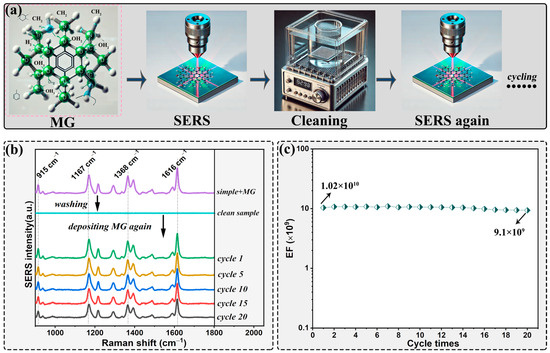 Diagram of the preparation and characterization of the microstructured Si substrates and the cycled Raman detection experiments (a); Raman spectra of microstructured Si on 10−7 M MG recycling for several times (b) and the corresponding EFs values for 20 cycles under 638 nm Raman excitation wavelength (c).