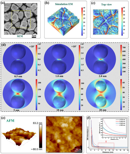 (a) SEM image depicting the mountain-like microstructures, serving as the zone guidance. (b) 3D simulation outcomes illustrating the intricate EM distributions across the model surface structures; (c) a top-down view of the simulated EM distributions; (d) enhanced exploration of EM interactions between two Au NPs, with the distance between them systematically varies from 0.5 nm to 20 nm; (e) AFM image showcasing the densely packed arrangement of deposited Au NPs on the microstructured substrate; (f) enhanced EM field profiles within the gaps between Au NPs of different particle size.