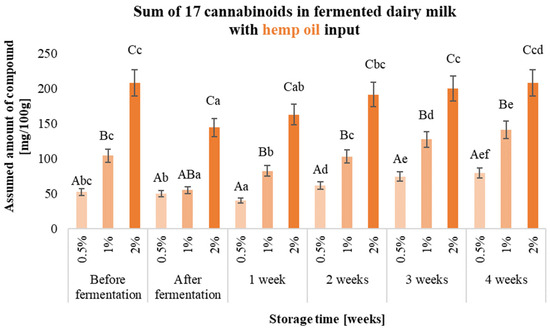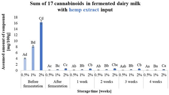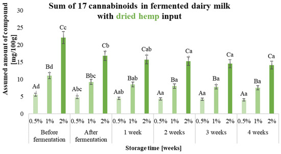 Sum of 17 cannabinoids in fermented dairy milk with hemp extract inputs (0.5%, 1% and 2% (w/v)) before and after fermentation and during 4 weeks of storage. a–d—the different small letters in one amount of the input used, for example, 0.5%, indicate significant differences (α < 0.05) influenced by storage time; A–C—the different capital letters within the different samples during a specific period of production and storage, e.g., ‘after fermentation’, indicate significant differences (α < 0.05).