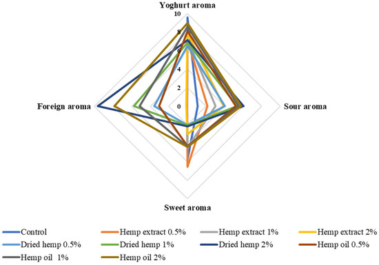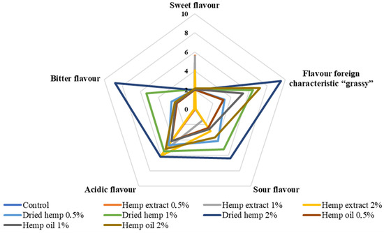 This is the first study on the sensory analysis of fermented dairy drinks with hemp inputs in different forms and contents. Previous studies have focused on preparing samples with extracts of herbs or plants more common than Cannabis sativa L. and include cinnamon, cardamom, garlic and lemongrass, among others [22,26]. Illupapalayam et al. [22] conducted a sensory evaluation of yoghurts with spice oleoresins extracted from cardamom, cinnamon and nutmeg. The prepared yoghurts achieved a sensory acceptance higher than 7 IU (conventional units) in all cases. In our study, only yoghurts containing hemp extracts (each variant of additive quantity) were rated lower than 7 IU.