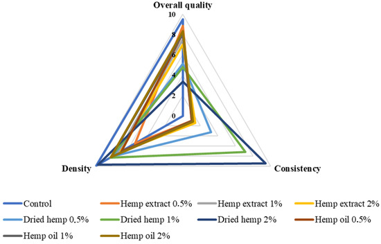 Density, consistency and overall quality of prepared fermented milk beverage control and with hemp inputs (scale 0–10; density: very thin—very thick; consistency: smooth—perceptible elements; overall quality: bad—very good).