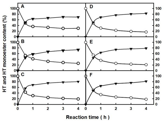 Time-course profiles of the enzymatic esterification of hexanoic acid, (A); octanoic acid, (B); decanoic acid, (C); lauric acid, (D); myristic acid; (E) and oleic acid, (F) with HT in [C12mim][NTf2] reaction medium. Free HT (○); HT-monoester product (▼).