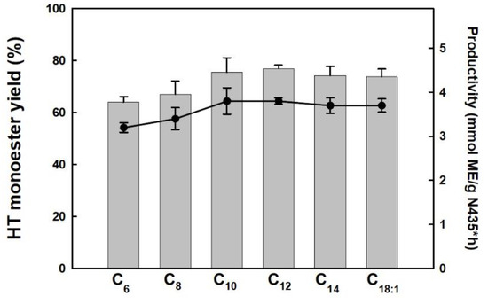 To analyze the suitability of the N435/[C12mim][NTf2] system for the lipophilization of HT, the biocatalytic synthesis of HT monoesters from fatty acids with different alkyl chain length was studied under the optimized reaction conditions.