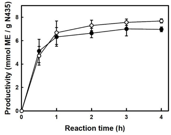 Time-course profiles of the accumulated productivity for the N435-catalyzed esterification of Hex with 0.5 mmol HT (●) or 5 mmol HT (○) (HT:Hex 1:2 mol:mol) using 100 mg N435/mmol HT in 70% (w/w) [C12mim][NTf2] at 80 °C.