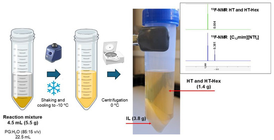 To build green chemical processes, it is necessary to develop integrated approaches for selective (bio)transformation and separation, capable of providing the products directly and the recovery for reuse of all the elements of the reaction system (e.g., biocatalysts, solvents, etc.). The SLILs (e.g., [C12mim][NTf2], etc.) are temperature-switchable ionic liquid/solid phases that behave as sponge-like systems that permit us to develop straightforward and clean approaches for product separation after the biocatalytic step by a simple protocol of cooling and centrifugation. By this approach, the SLIL precipitates as a solid salt at the bottom, while the products remain in the upper liquid phase, as pure products when they are liquids or dissolved in another green molecular cosolvent (e.g., water, etc.) previously added [14,15,17,22]. For this system, the full release of HT-monohexanoate and unreacted HT from the IL matrix could not be achieved by simple cooling and centrifugation of the reaction mixture, as occurred for volatile flavors [15]. For the proper extraction of these compounds, the addition of propylene glycol:water (PG:H2O, 85:15 v/v) green solution was necessary, providing a liquid–liquid biphasic system. This mixture was then fully shaken, cooled and centrifuged to precipitate the solid SLIL (bottom phase), while the released HT and HT-monohexanoate were accumulated in the propylene glycol:water phase (upper phase, see Figure 5). Briefly, five volumes of PG: H2O (85:15 v/v) were added to 4.5 mL (4.5 g) of the reaction mixture from the biocatalytic step for HT-monohexanoate synthesis in [C12mim][NTf2]. From the initial mass of 4.5 g, a total of 1.35 g made of HT-Hex (94%) and unreacted HT (6%) were recovered in the liquid phase. A 19F-NMR analysis (insert in Figure 5 and Figure S8) showed the presence of traces of SLIL (up to 1%) that can be fully eliminated by other classical procedures (i.e., ionic exchange column). The precipitated SLIL accounted for 4.2 g and its white color (identical to the pure SLIL) points to almost the total release of the reaction species. Only a content of 10% HT-Hex was still retained in the ionic net, having the possibility to carry out another purification step or to directly reuse this SLIL in another operational cycle.