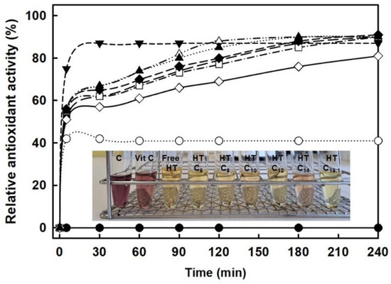 Time-course profiles of the relative antioxidant activity of free HT (▼) and HT monoesters based on different alkyl-chain lengths (C6, △; C8, ■; C10, □; C12, ◆; C14, ♢; C18:1, ▲; overall content in HT species: 80 nmol), determined spectrophotometrically at 517 nm during 4 h with DPPH. Vitamin C (80 nmol, ○) was used as an antioxidant standard reference. A sample of DPPH without any antioxidant (●) was used as a control to establish the zero value. Insert picture: final color displayed by each sample after the DPPH test.