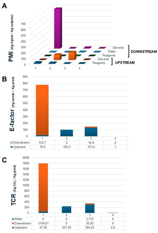 From the PMI parameter, the E-Factor refers to the overall generated waste, while the TCR parameter points to the waste contribution to CO2 emissions (see Table S1 and Figure 8B,C) [34]. The results obtained for E-factor and TCR follow the same pattern as that observed for the PMI case, pointing again to the negative character of non-recoverable solvents to the environmental burden.