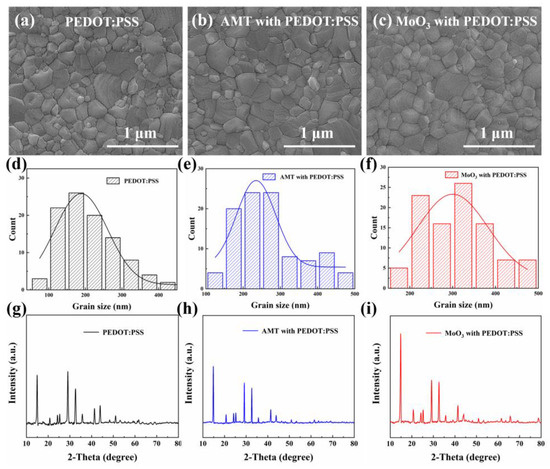Next, in order to study the growth and crystallization of perovskite on different modified PEDOT:PSS HTLs, we fabricated perovskite films on different HTLs and tested thire SEM images. As shown in Figure 2a–c, the perovskite film prepared on pure PEDOT:PSS shows disordered grain size, many small grains are distributed on the film, and the grain boundary is also not clear, which is unfavorable to the performance of the PSCs. However, after AMT introduction, the perovskite grains become more ordered and the grain boundaries are clearer than those of pure PEDOT:PSS, but there are still a few small disordered grains upon the film. This phenomenon is significantly improved after the introduction of MoO3 NPs. The grain distribution and grain boundary of perovskite are better than the other two. After statistics of the average grain size data of perovskite (Figure 2d–f), the average grain size of pure PEDOT:PSS-based perovskite is 210 nm, while for AMT- and MoO3-NP-modified samples, the data are 270 and 310 nm respectively. Reducing the grain boundaries and increasing grain size can enhance the transport properties of the perovskite layer by minimizing charge carrier recombination, so as to improve the carrier transport efficiency of the calcium titanite layer [31,32]. In order to further study the crystallinity of perovskite films on different HTLs, we measured the XRD spectra of perovskite active layers on different HTLs. As shown in Figure 2g–i, the coordinate scales in the figures are unified. When PEDOT:PSS modified with MoO3 NPs, the intensity of diffraction peak became stronger than that of perovskite film on pure and AMT-modified PEDOT:PSS. It means that the addition of MoO3 NPs is conducive to the growth of perovskite grains upon HTLs, which is consistent with the above SEM results. This shows that the introduction of MoO3 NPs significantly improves the quality of the interface between HTL and perovskite, thus improving the growth and crystallization of perovskite.