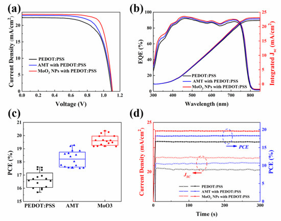 It should be highlighted that the EQE results and integrated JSC derived from the EQE curve aligns with that from the J–V curves, as depicted in Figure 3b (the integrated JSC for control, AMT- and MoO3-NP-modified devices are 22.13, 22.68 and 23.10 mA/cm2, respectively). The PCE distribution data in Figure 3c indicates that the device with MoO3 NP modification exhibits enhanced repeatability and statistical reliability in comparison to the oure PEDOT:PSS and AMT-modified counterparts. This may be due to the better crystallinity of perovskite modified by MoO3 NPs. Furthermore, to assess the output stability of PSCs, we determined the constant photocurrent at the maximum power point of the devices (illustrated in Figure 3d). It could be noticed that the devices, both with and without introduction, sustain consistent JSC and PCE under their maximum output power voltage. These outcomes align with the data derived from the J–V curve examination, thereby confirming the devices’ output reliability based on different HTLs.