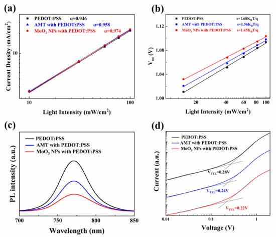 The α indicator is associated with the extent of compositeness. In particular, as the α approaches 1, the rate of bimolecular recombination diminishes. Figure 4a illustrates that the α for pure, AMT-modified and MoO3-NP-modified PEDOT:PSS are 0.946, 0.958 and 0.974, respectively. This finding indicates that the incorporation of two kinds of modifiers leads to a more pronounced reduction in bimolecular recombination within the perovskite layer compared to the unmodified counterparts.