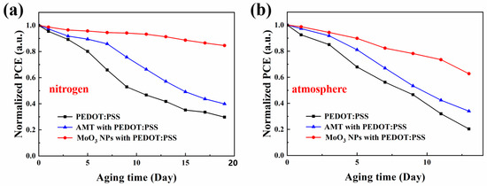 For devices stored in the atmosphere, as illustrated in Figure 5b, devices with an HTL containing MoO3 NPs maintained 63% of their initial PCE after 13-day exposure, whereas devices with pure PEDOT:PSS HTL only retained 20% of their initial efficiency. Furthermore, devices with AMT in the HTL showed 34% of their original efficiency. The above discussion shows that using MoO3-NP-modified PEDOT:PSS as HTL can not only improve the lifetime of PSCs in nitrogen, but also optimize the stability of devices in atmospheric environment.