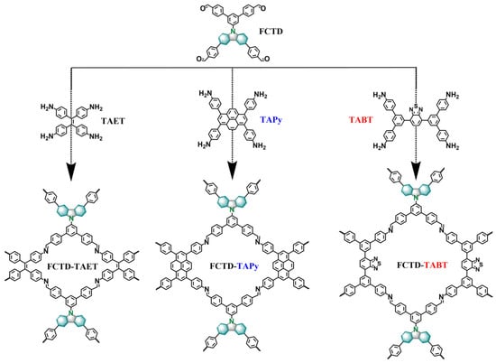 As illustrated in Figure 1 and detailed in the Experimental Section of the Supplementary Materials, a [4 + 4] condensation reaction was employed to synthesize three COFs. Specifically, these COFs were synthesized by linking FCTD to different building blocks: TAPy, TAET, and TABT under solvothermal conditions. In detail, FCTD-TAPy was synthesized via the Schiff-base reaction of FCTD and TAPy in the presence of 6 mol/L acetic acid, using N, N-dimethylacetamide (DMAC), and n-butyl alcohol (n-BuOH) as solvents at 120 °C for 72 h. FCTD-TAET and FCTD-TABT were synthesized in a similar manner to FCTD-TAPy with variations in the choice of solvent and building blocks.