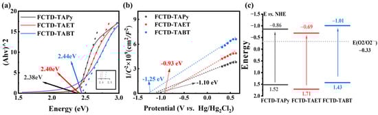 (a) Tauc plots, (b) Mott–Schottky plots, and (c) schematic energy band structures of FCTD-TAPy, FCTD-TAET, and FCTD-TABT.