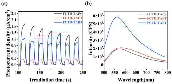 (a) Transient photocurrent responses and (b) PL spectra of FCTD-TAPy, FCTD-TAET, and CTD-TABT in the solid state.