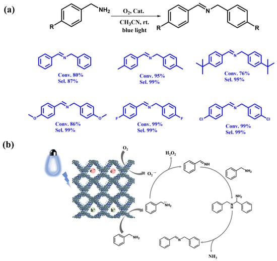 (a) The yield and selectivity of photocatalytic selective oxidative coupling of diverse amines, (b) Plausible mechanism for the photocatalytic selective oxidative coupling of benzylamine.