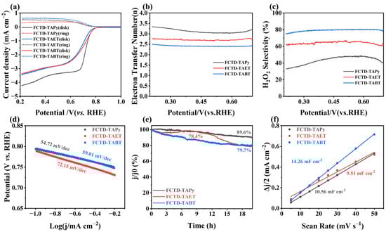 We explored their catalytic performance in oxygen reduction reactions (ORRs) [21,22,23]. Cyclic voltammetry (CV) was conducted in both N2-saturated and O2-saturated KOH (0.1 M) solutions at a scan rate of 50 mV s−1 (Figure S12a–c). The CV current density in the O2-saturated electrolyte was significantly higher than in the N2-saturated electrolyte, with a distinct reduction peak observed at 0.64 V, 0.67 V, and 0.69 V for FCTD-TAPy, FCTD-TAET, and FCTD-TABT, respectively. Their electrocatalytic ORR activity was further assessed using a rotating ring-disk electrode (RRDE) in an O2-saturated 0.1 M KOH solution. The linear sweep voltammetry (LSV) curves at 1600 rpm revealed that the onset potentials (Eo) of FCTD-TAPy, FCTD-TAET, and FCTD-TABT were 0.84, 0.84, and 0.87 V (vs. RHE); half-wave potentials (E1/2) were 0.72, 0.69, and 0.68 V (vs. RHE); and the limiting diffusion current densities (JL) were 4.23, 3.44, and 3.38 mA cm−2, respectively (Figure 6a). As indicated in Figure 6d, the Tafel slope for FCTD-TAPy was 51.07 mV/dec, which was lower than 66.55 mV/dec for FCTD-TAET and 53.01 mV/dec for FCTD-TABT. A lower Tafel slope suggested faster ORR kinetics for FCTD-TAPy, which was further corroborated by its highest dynamic current density of 5.92 mA cm−2 at 0.7 V (vs. RHE) (Figure S15a). Additionally, the electrical conductivities of the COFs were evaluated via electrochemical impedance spectroscopy. The charge transfer resistances for FCTD-TAPy, FCTD-TAET, and FCTD-TABT were 97, 181, and 207 Ω, respectively (Figure S13), indicating superior electron transfer capabilities in FCTD-TAPy.