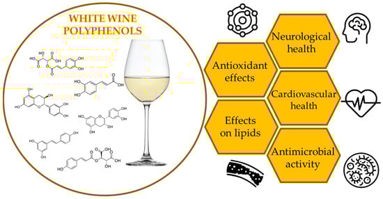There is still a lack of evidence to fully confirm and evaluate the biological effects of polyphenols in white wine. The polyphenols profile of white wines is complex, and their biological effects depend on the concentrations of individual polyphenols as well as on their ratios. Additionally, other parameters, such as intermolecular interactions, dissociation, ionization, matrix interference, etc., need to be included in order to perceive the complete potential of white wine polyphenols. Consequently, the biological potential of the complete mixture can be additive, synergistic, or antagonistic [23,24,25]. Evidence of their positive effects on human health could also increase the interest in exploring the possibility of their use as dietary supplements. Additional research is therefore needed to further expand knowledge in this area [26]. Data regarding the bioavailability of polyphenols is also very important for a more precise interpretation of the observed effects [27]. For a better understanding of this topic, the present review brings summarized information about the most abundant polyphenols in white wines but also their potential health effects such as neuroprotective and cardioprotective activities, antioxidant, antimicrobial activity and positive effects on lipids.