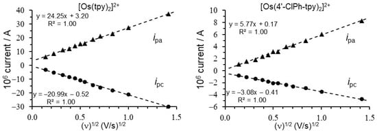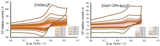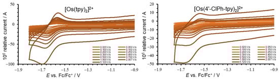 The oxidation and reduction of osmium(II) coordinated to different 2,2′:6′,2″-terpyridines have been reported [19,20,25,32,35,36,37,38,39]. The oxidation of the molecules is reported to be metal-based [19], while the reduction of the complexes is reported to occur on the coordinated polypyridine ligands [19,32], as illustrated in Scheme 4. Earlier reports wrongly assigned the reduction to Os(II/I) [20,35,37] and Os(I/0) [20,37]. Only a few cyclic voltammograms (CVs), at only one scan rate (ν), were provided in the literature [32,38,39,40,41]. Some benefits of obtaining redox data and corresponding cyclic voltammograms at varying scan rates are (i) to confirm that the electrochemical behavior observed at 0.100 V s⁻¹ remains consistent at higher scan rates, (ii) to assess whether the reduction process is diffusion-controlled by applying the Randles–Ševčík equation, and (iii) to calculate the diffusion coefficients of the analyte, which is crucial for understanding the reactivity of the species being studied, also through the application of the Randles–Ševčík equation. Therefore, this section presents an electrochemical study using CV experiments on a series of bis(terpyridine)Os(II) complexes (1)–(7), at a series of scan rates ν = 0.02–5.00 Vs−1.