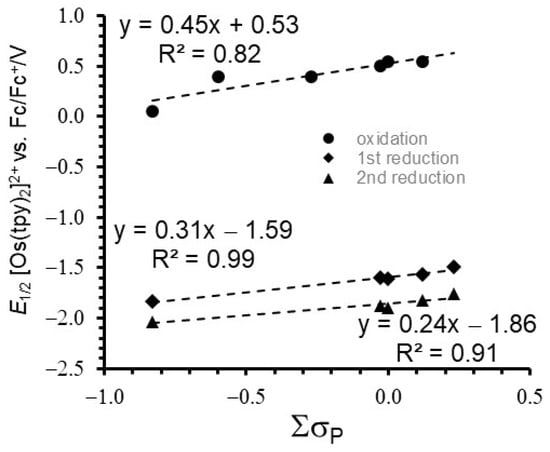 In the scientific literature, the Hammett substituent constants (σ) [51] are widely used to quantify the electronic effect on the central metal (oxidation) and the ligands (reduction) of a substituent group on a phenyl or a related aromatic group in the complex to which it is bound [52]. The oxidation potential (E1/2,ox) and the two reduction potentials are correlated with the sum of σ of the substituents on the tpy-ligand in compounds (1) to (7), see Figure 8. The strong correlation across all three trends indicates that σ can be used as a measure of the electronic effect of the substituent groups in [Os(tpy)2]2+ complexes containing differently substituted tpy ligands.