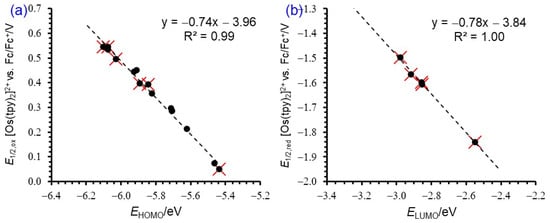 Relationship between the experimental (a) E1/2,ox and DFT solvent phase (CH3CN)-calculated EHOMO and (b) E1/2,red and the DFT solvent phase (CH3CN)-calculated ELUMO, for the series of [Os(tpy)2]2+ (this study, data highlighted with red crosses), [Os(bpy)3]2+ and [Os(phen)3]2+ (from the literature).