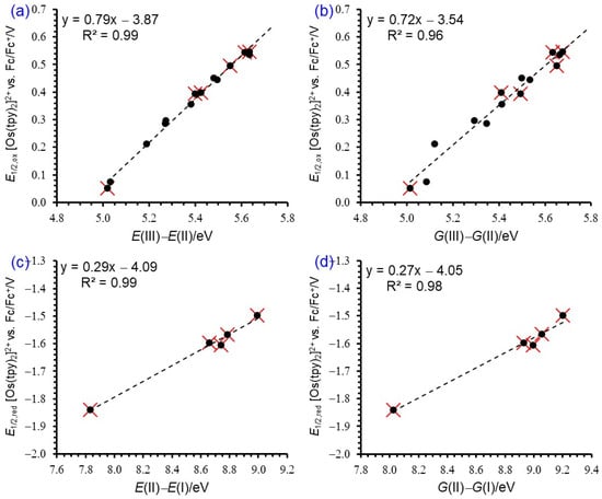 Relationship between the experimental E1/2,ox/red and (a,c) the DFT-calculated electronic energy E difference and (b,d) the DFT-calculated free energy G difference of the DFT solvent phase (CH3CN) optimized [Os(tpy)2]2+ (this study, data highlighted with red crosses), [Os(bpy)3]2+ and [Os(phen)3]2+ (from the literature) and their oxidized/reduced forms.