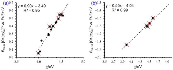 Relationship between the experimental (a) E1/2,ox and (b) E1/2/,red and the DFT solvent phase (CH3CN)-calculated electronegativity (χ) of the molecules, for the series of [Os(tpy)2]2+ (this study, data highlighted with red crosses), [Os(bpy)3]2+ and [Os(phen)3]2+ (from the literature).