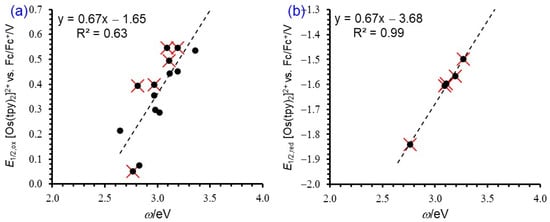 Relationship between the experimental (a) E1/2,ox and (b) E1/2,red and the DFT solvent phase (CH3CN)-calculated electrophilicity index (ω) of the molecules, for the series of [Os(tpy)2]2+ (this study, data highlighted with red crosses), [Os(bpy)3]2+ and [Os(phen)3]2+ (from the literature).