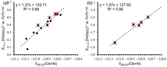 Relationship between the experimental (a) Eox and (b) Ered and the DFT solvent phase (CH3CN)-calculated MESP (au), for the series of [Os(tpy)2]2+ (this study, data highlighted with red crosses), [Os(bpy)3]2+ and [Os(phen)3]2+ (from the literature). Data of (7) did not fit in (a).
