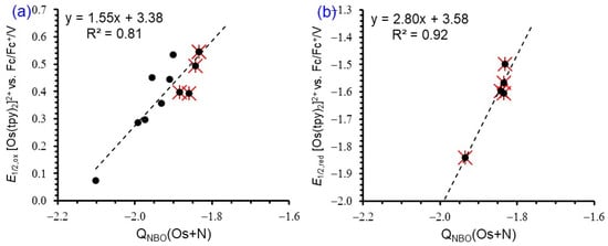 Relationship between the experimental (a) Eox and (b) Ered and the DFT solvent phase (CH3CN)-calculated NBO charges Q (e−), for the series of [Os(tpy)2]2+ (this study, data highlighted with red crosses), [Os(bpy)3]2+ and [Os(phen)3]2+ (from the literature). Data of (7) and (15) did not fit in (a).
