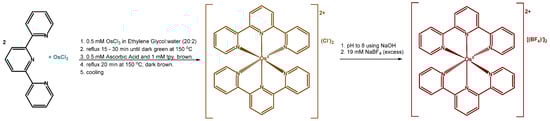 The synthesis scheme of bis(terpyridine)osmium(II) complexes (1)–(7) in Scheme 1 is portrayed in Scheme 3. Os(III) in OsCl3 was reduced to Os(II) by the high boiling point solvent, ethylene glycol [34], as well as ascorbic acid. The tpy ligands were then reacted with Os(II) to produce [Os(tpy)2](Cl)2. After cooling, an excess of NaBF4 was added to the mixture to obtain the dark brown product [Os(tpy)2](BF4)2.